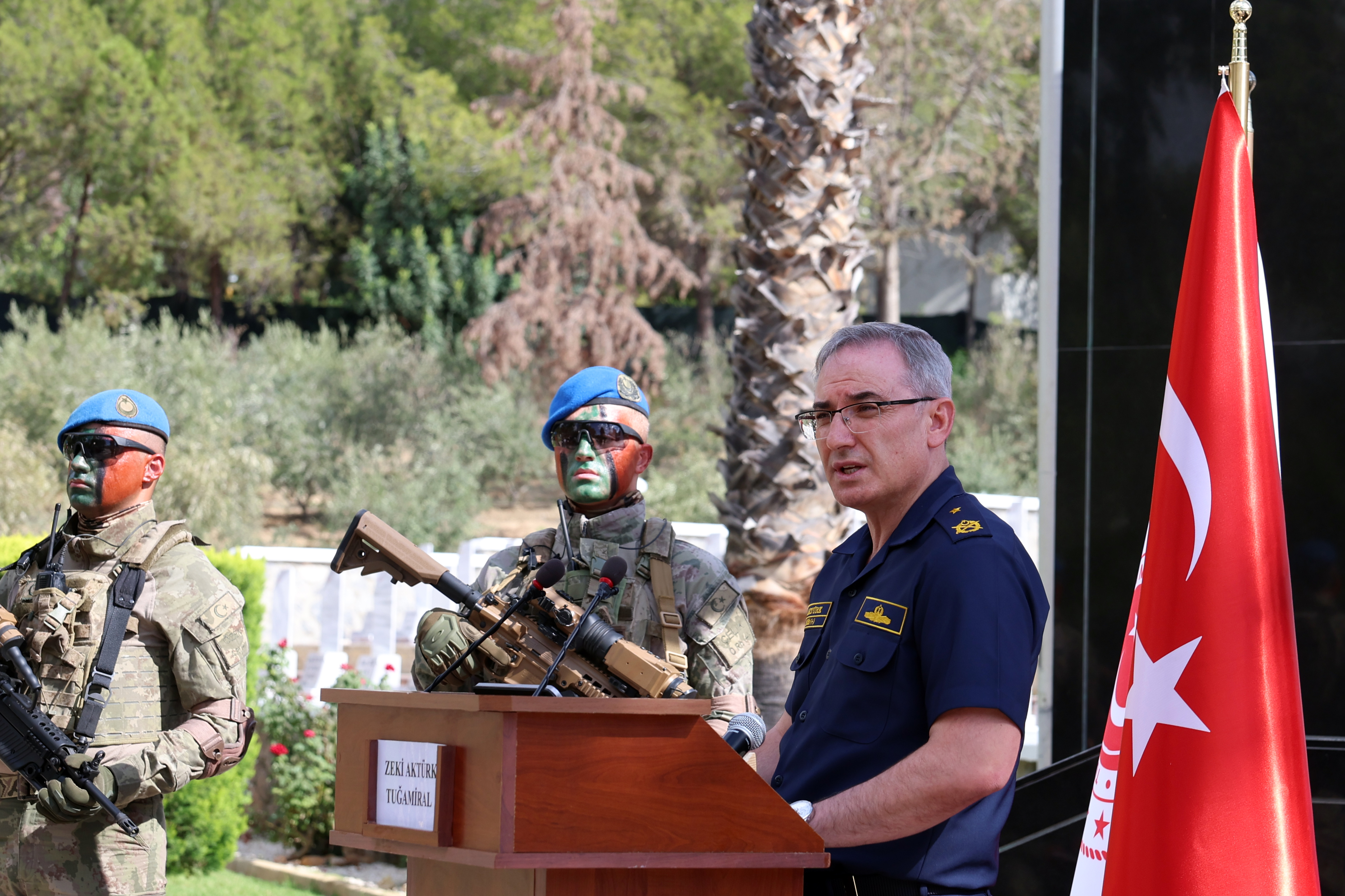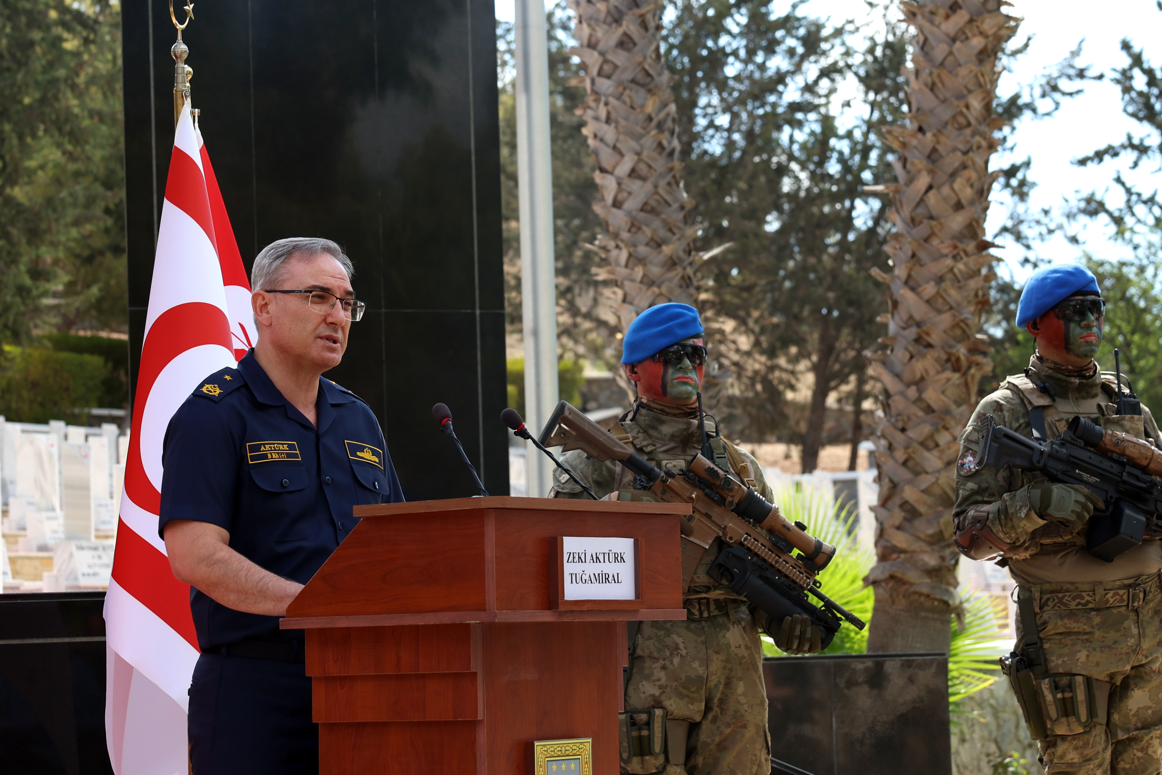 MSB Basın ve Halkla İlişkiler Müşaviri ve Bakanlık Sözcüsü Tuğamiral Zeki Aktürk, 20 Temmuz 1974'te gerçekleştirilen Kıbrıs Barış Harekatı'nda vatan ve millet uğruna şehit olan kahraman Mehmetçiğin ve mücahitlerin yan yana yattığı Girne Boğazköy Şehitliği'nde düzenlenen haftalık basın bilgilendirme toplantısında konuştu.