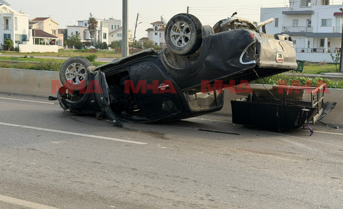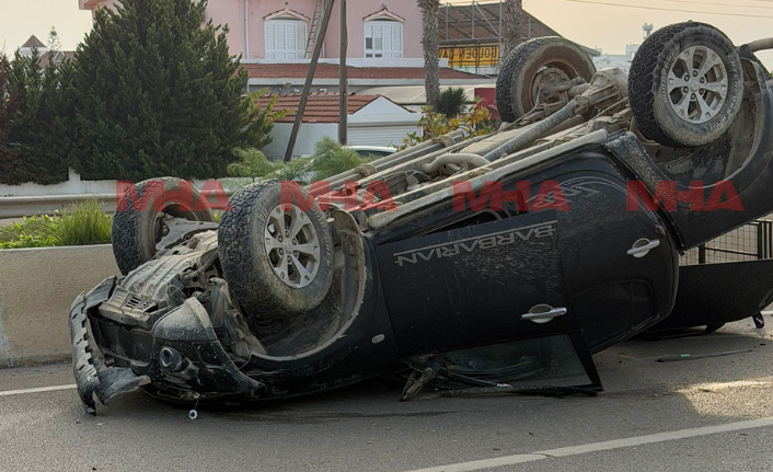 Gazimağusa–İskele ana yolunda, Salamis Hotel karşısında bu sabah meydana gelen kazada, seyir hâlindeki pikap araca arkadan çarpan mavi renkli Suzuki model bir araç, pikabın orta refüje vurmasına ve tavanı üzerine devrilmesine neden oldu.