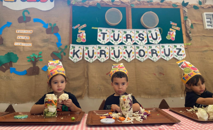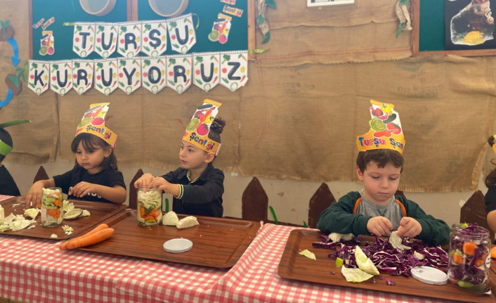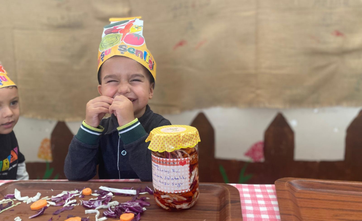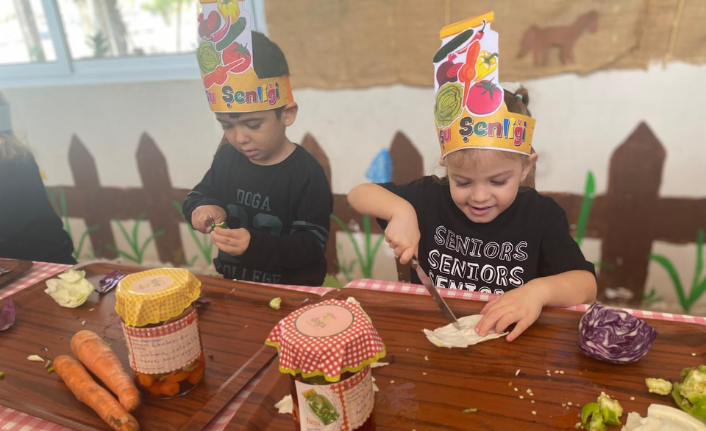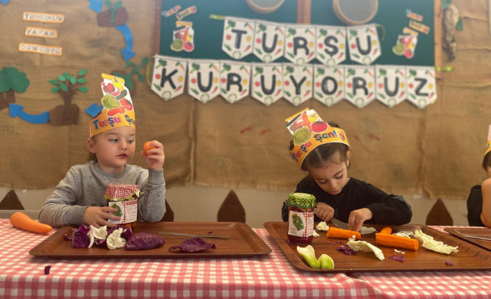 Anaokulu ve 1. sınıf öğrencileri, öğretmenlerinin rehberliğinde hem toprağa dokunmanın keyfini yaşadı hem de kendi elleriyle turşularını kurarak üretmenin sevincini tattı.
