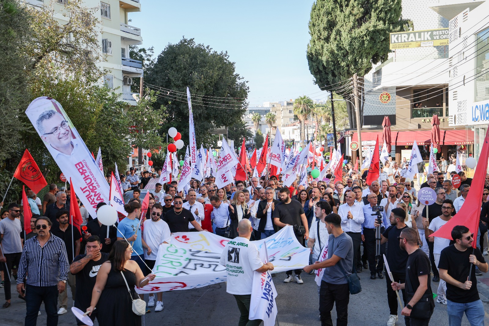 Kalabalığın coşkulu tezahüratları eşliğinde Dereboyu’na giriş yapan Erhürman, birlik, dayanışma ve sevgi mesajları verdi.