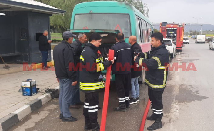 Gönyeli Çemberi yakınlarında çalışır durumdaki minibüs, arka far kablolarının kısa devre yapmasıyla yandı; araçta maddi hasar oluştu.