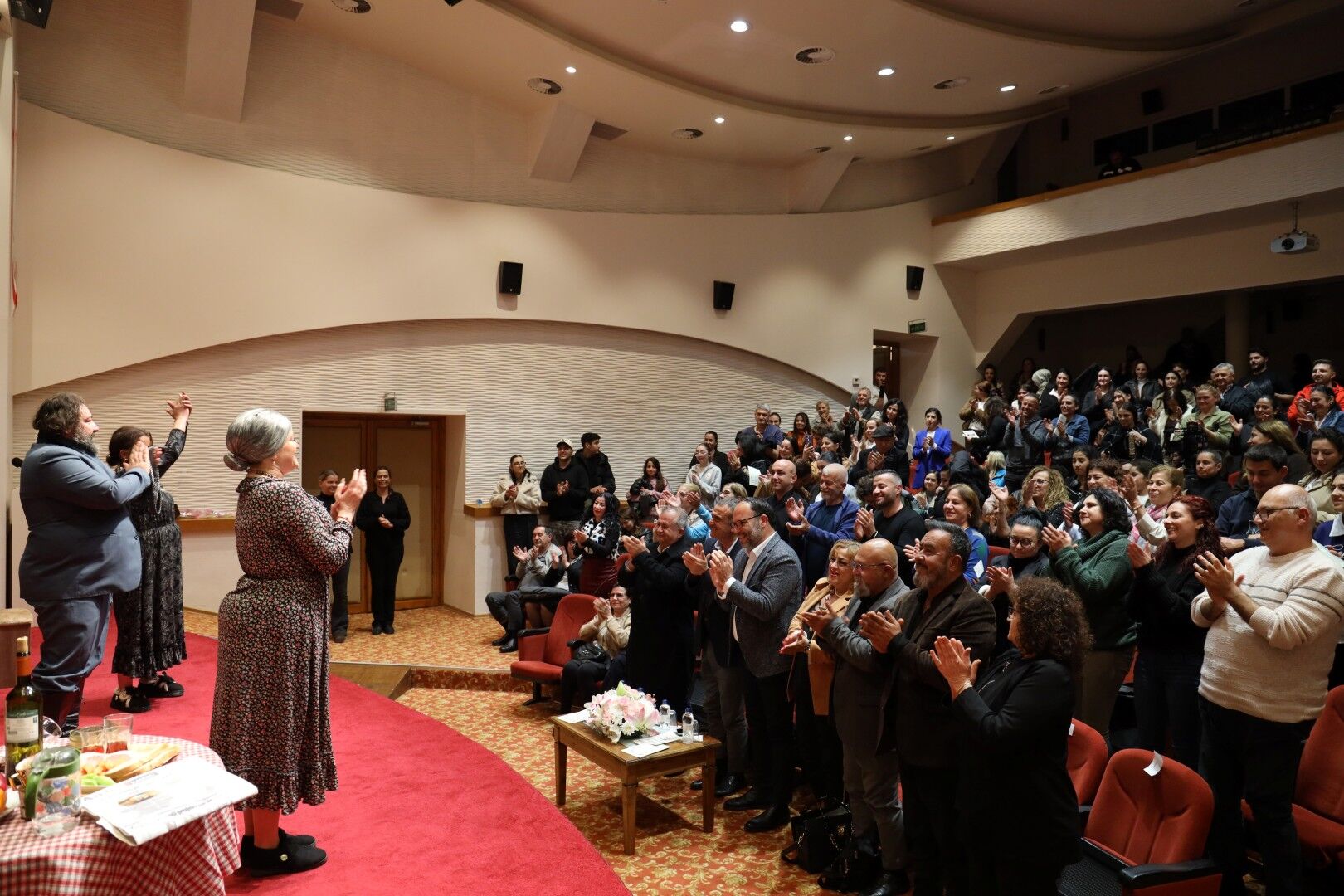 Oyun bitiminde tiyatro severleri sahnede selamlayan tüm ekip adına konuşan İskele Belediye Tiyatrosu Yönetmeni Sami Yakar, tiyatronun büyük fedakarlıklar gerektiren bir şey olduğunu ifade ederek, oyunun hazırlanmasında büyük fedakarlıklar gösteren ekibi tebrik etti.