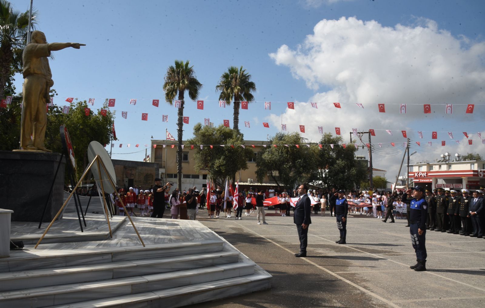 Stadyumdaki tören öncesinde ise İskele Atatürk Anıtı ve Ecevit Meydanı’nda törenler düzenlendi.Anıta çelenkler sunulmasının ardından kortej eşliğinde stadyuma yüründü.