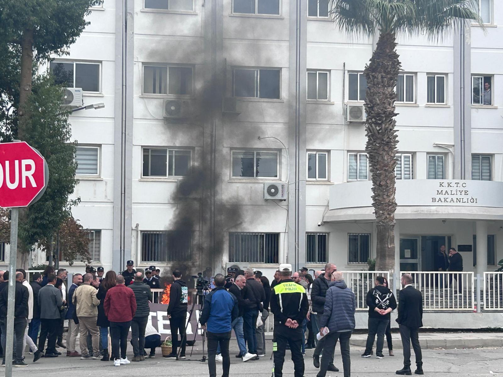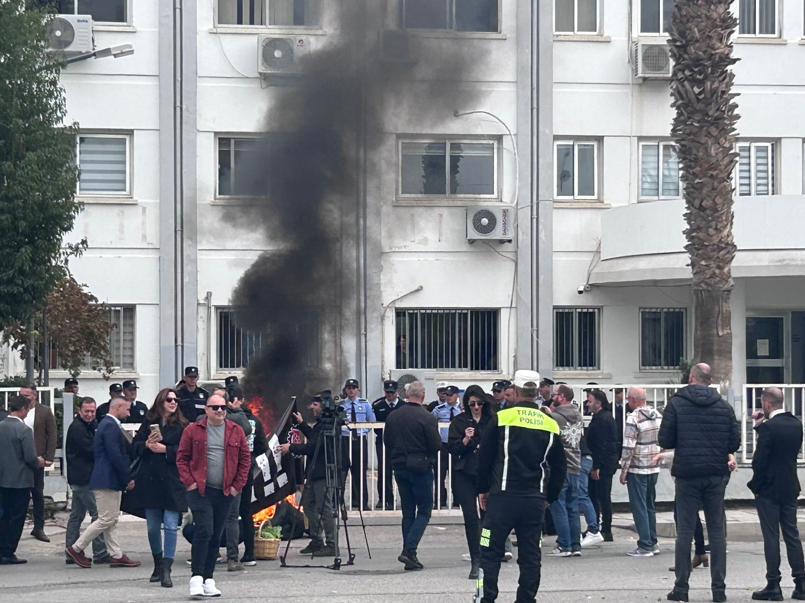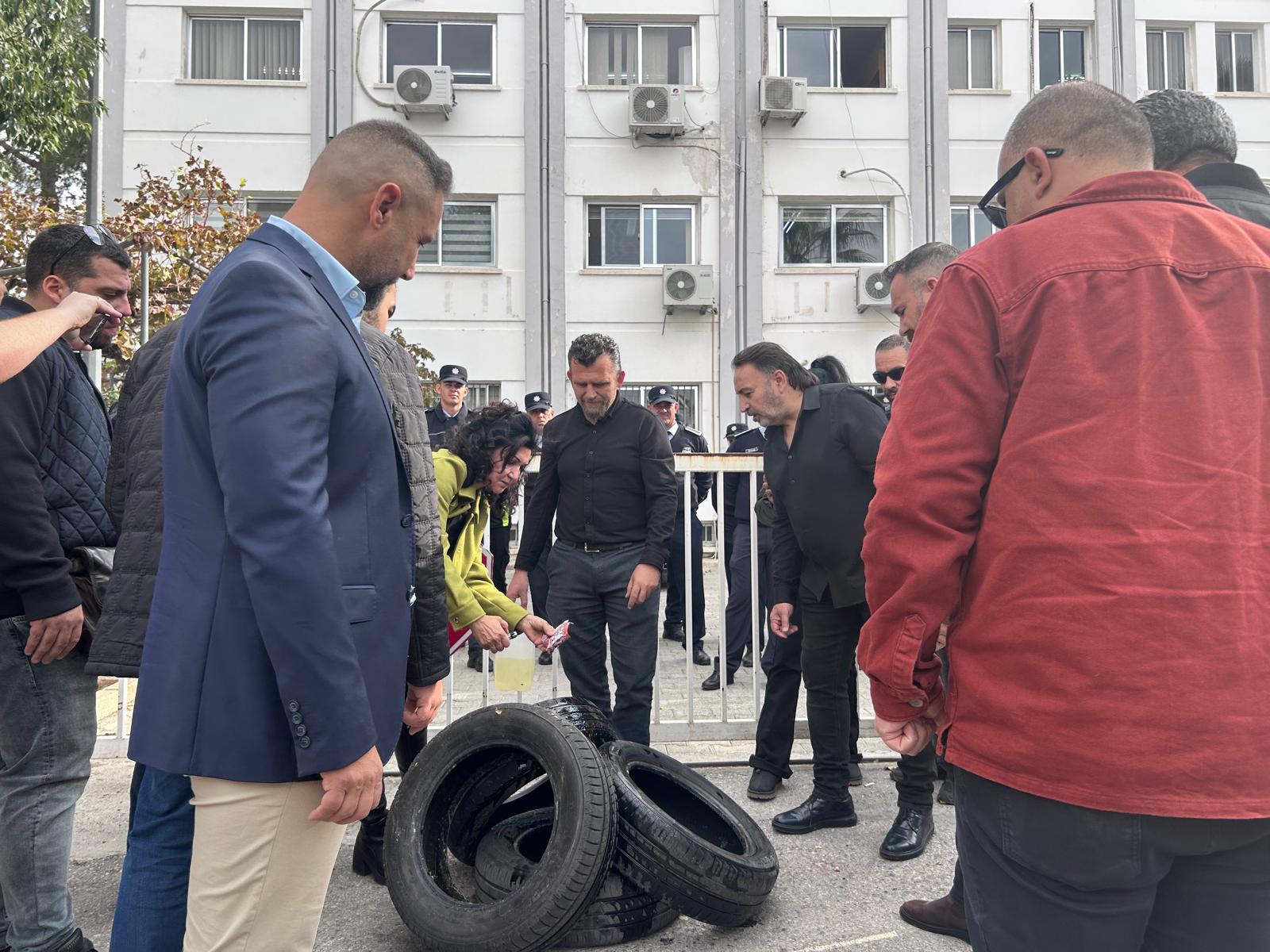 Kıbrıs Türk Kamu Görevlileri Sendikası (KAMUSEN), Kıbrıs Türk Amme Memurları Sendikası (KTAMS), Kıbrıs Türk Öğretmenler Sendikası (KTÖS), Kıbrıs Türk Orta Eğitim Öğretmenler Sendikası (KTOEÖS) ve Kıbrıs Türk Kamu İşçileri Sendikası'nın (Kamu-İş) düzenlediği eylemde araba lastiği de yakıldı.