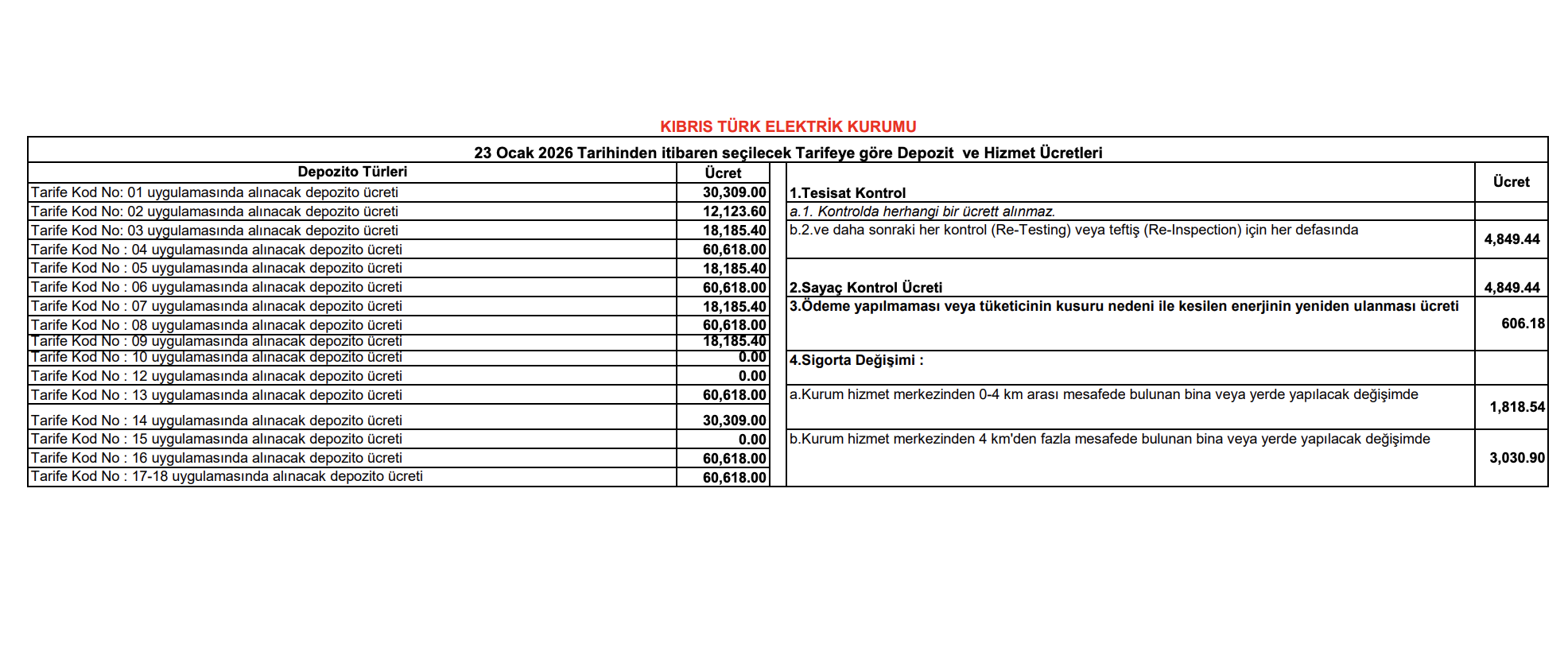 Kıbrıs Türk Elektrik Kurumu (KIB-TEK), yeni asgari ücretin belirlenmesiyle birlikte tarifeye göre alınan depozit ve hizmet ücretlerinde güncelleme yaptı.