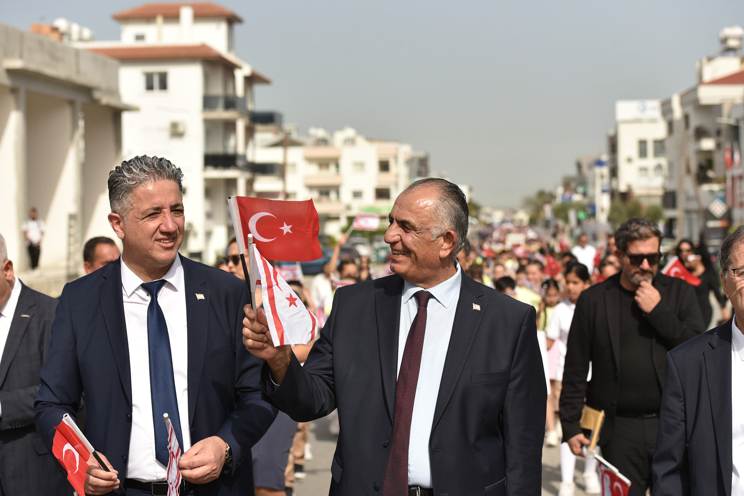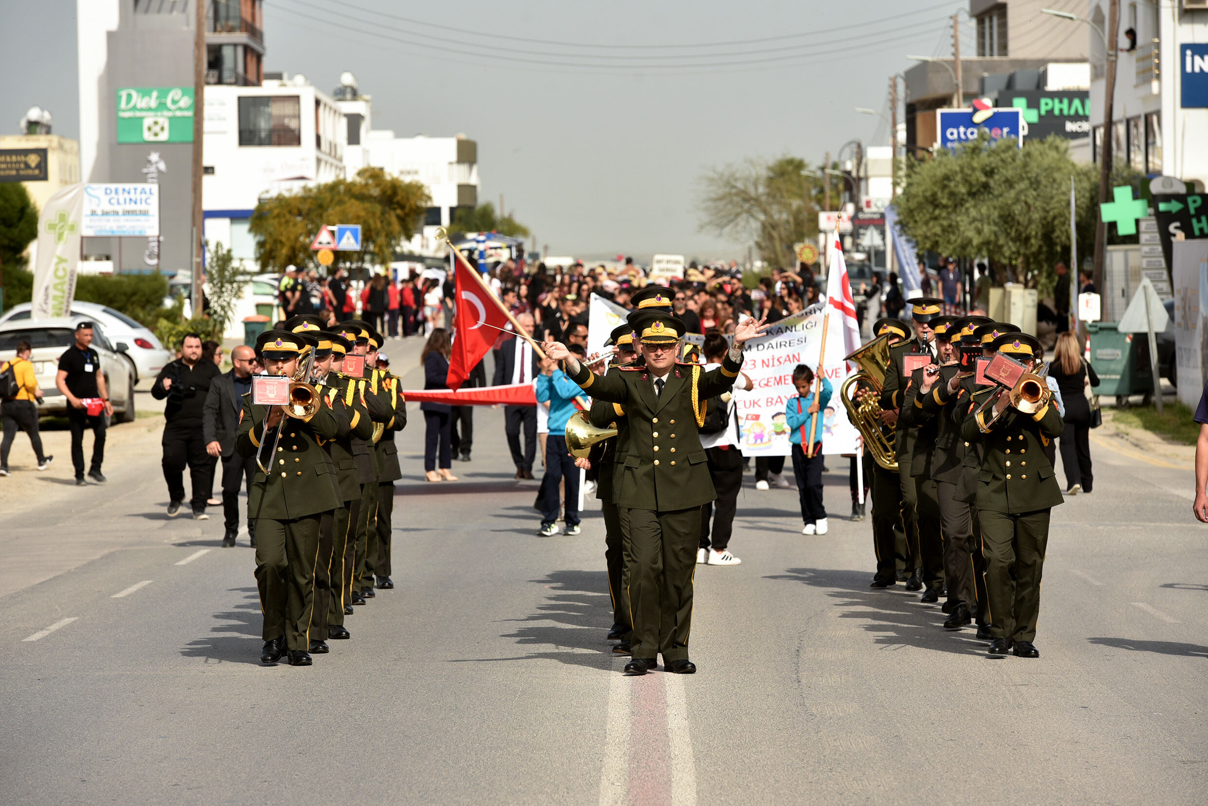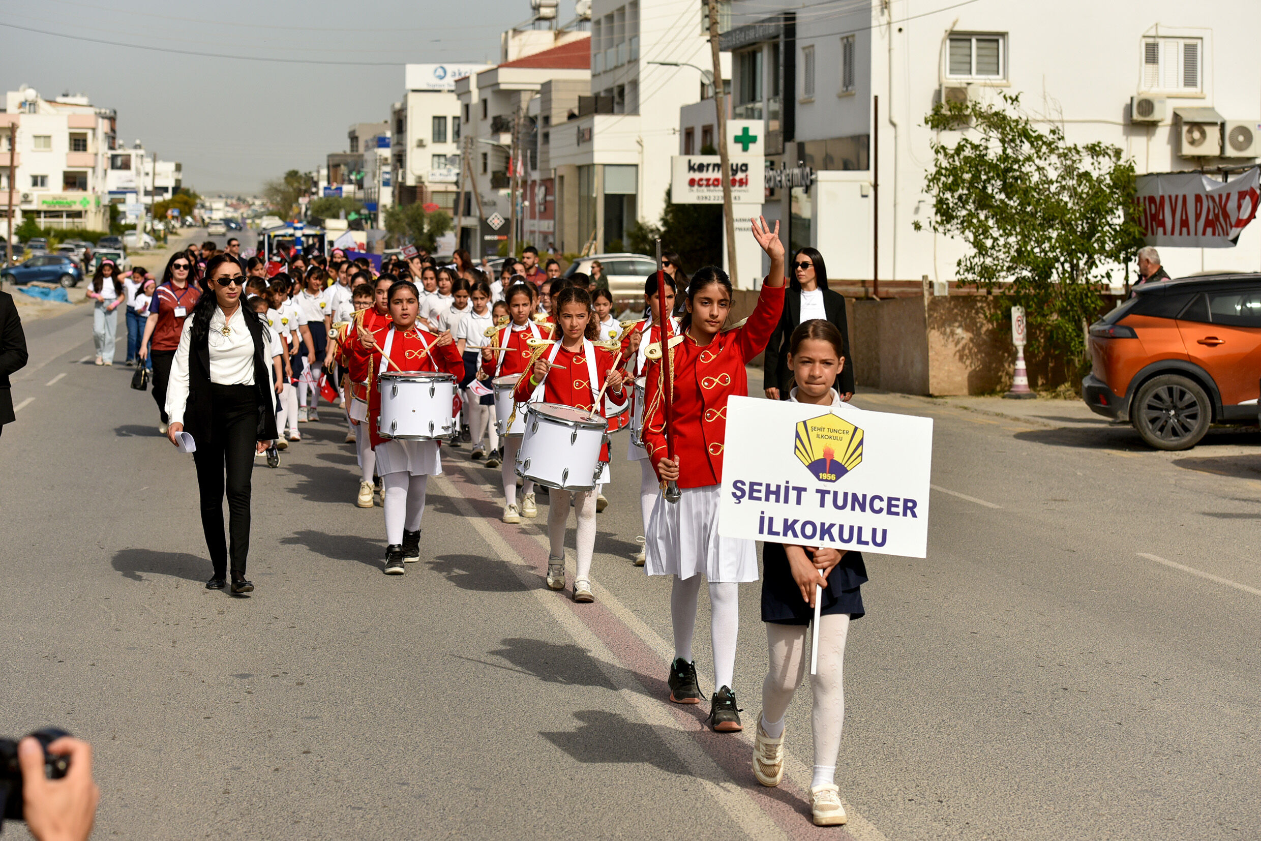 Güvenlik Kuvvetleri Komutanlığı Bandosu eşliğinde, Lefkoşa’daki ilkokul öğrencilerinin katılımıyla düzenlenen ve Metehan’dan başlayarak Cumhurbaşkanlığı ile Cumhuriyet Meclisi güzergâhında devam eden yürüyüşe, Milli Eğitim Bakanı Nazım Çavuşoğlu ile Bakanlık yetkilileri ve öğretmenler katıldı.