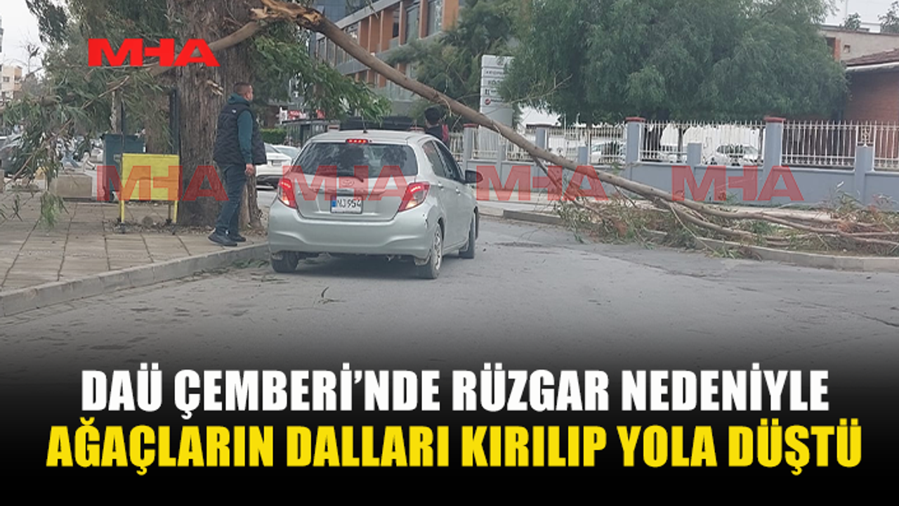 Doğu Akdeniz Üniversitesi (DAÜ) çemberinde etkili olan rüzgar nedeniyle okaliptüs ağaçlarının bazı dalları kırılarak yola düştü.