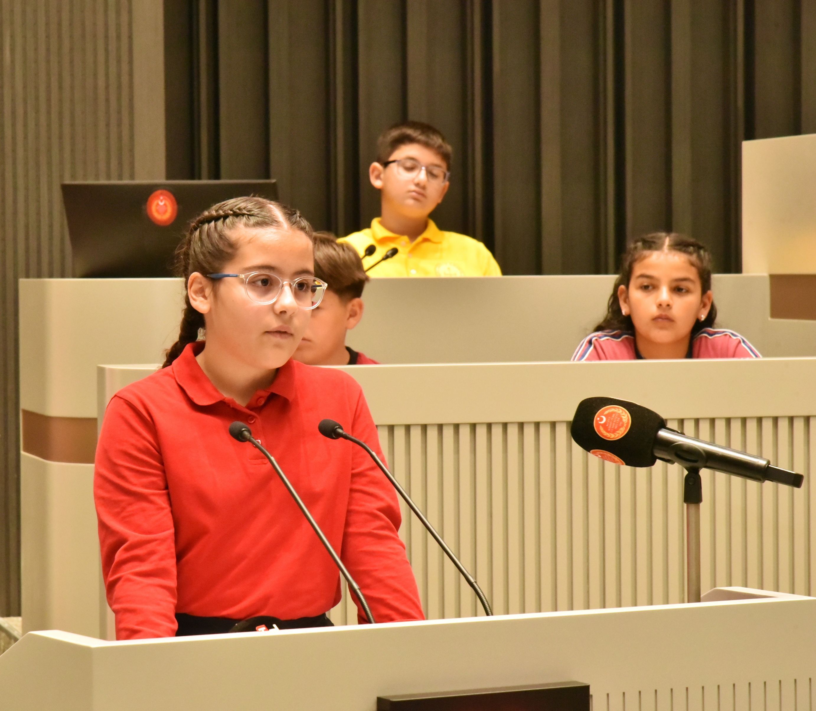 Öğrenciler, Genel Kurul’da yaptıkları konuşmalarda, özellikle Çocuk Hakları Bildirgesi’nden alıntılar yaparak, daha eşit ve daha adil bir dünya dileğini dile getirdi.