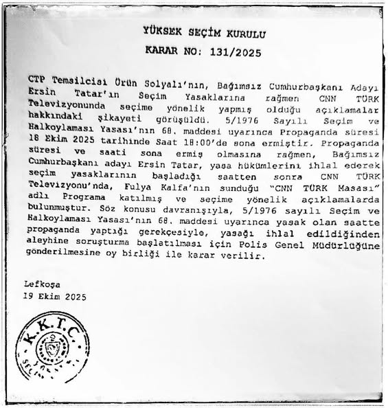 Yüksek Seçim Kurulu (YSK), Cumhurbaşkanı ve Cumhurbaşkanı adayı Ersin Tatar’ın dün akşam CNN Türk yayınına bağlanarak yaptığı konuşmanın yasaya aykırı propaganda niteliği taşıdığına dikkat çekti.
